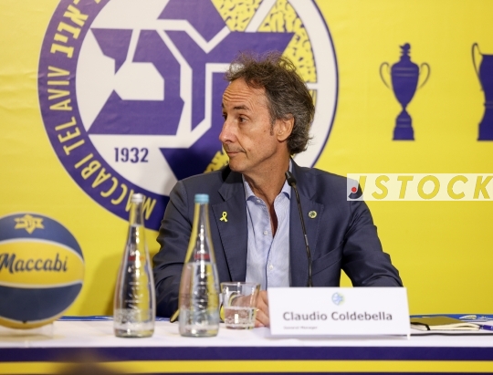 BKB-ISR Israeli Basketball Premier League – Press conference presenting Claudio Coldebella as the new Sporting Director of Maccabi Tel Aviv. Several fans protested outside the press conference against the club's conduct, July 08, 2025, Yad Eliyahu (Menora Mivtachim Arena), Tel Aviv, Israel.