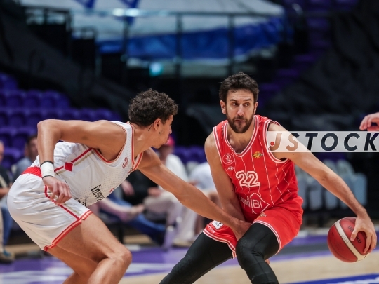 BKB-ISR Winner Cup Semifinal – Hapoel Tel Aviv (in red) vs. Hapoel HaEmek (in white), September 27, 2025, Menora Mivtachim, Tel Aviv, Israel.