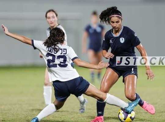 FBL-ISR Athena Cup Group Stage Matchday 3 MS Kiryat Gat in blue vs. AS Ramat HaSharon in white, August 27, 2025, Toto Stadium Bat Yam, Bat Yam, Israel.Photo by Shaul Greenfeld JStock