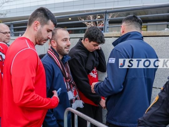 FBL-ISR Israeli Premier League – Police officers inspecting fans' clothing at the entrance, following a ban by the Tel Aviv District Commander on shirts criticizing the police. Pre-match between Hapoel Ironi Kiryat Shmona vs. Hapoel Tel Aviv , December 13, 2025, Netanya Stadium, Netanya, Israel.