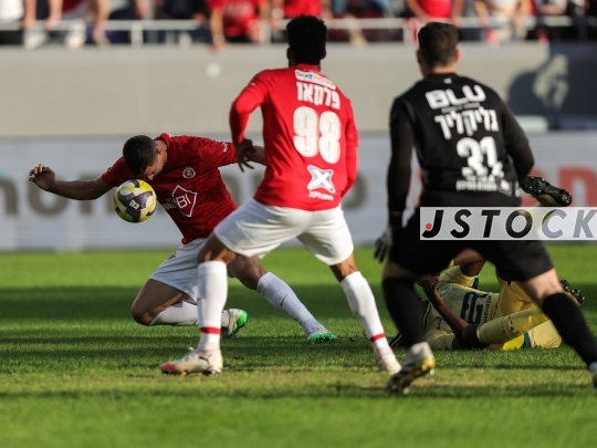 FBL-ISR Israeli Premier League Matchday 15 – Hapoel Tel Aviv (in red and white) vs. Maccabi Bnei Reineh (in yellow), December 20, 2025, Bloomfield Stadium, Tel Aviv, Israel.
