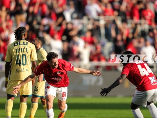 FBL-ISR Israeli Premier League Matchday 15 – Hapoel Tel Aviv (in red and white) vs. Maccabi Bnei Reineh (in yellow), December 20, 2025, Bloomfield Stadium, Tel Aviv, Israel.