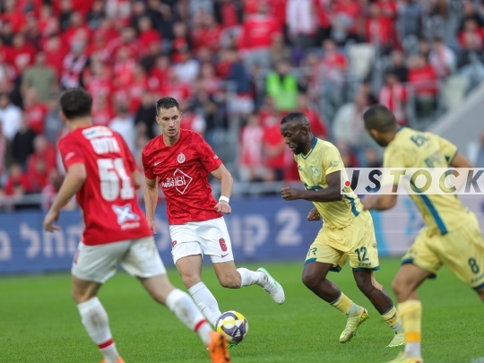 FBL-ISR Israeli Premier League Matchday 15 – Hapoel Tel Aviv (in red and white) vs. Maccabi Bnei Reineh (in yellow), December 20, 2025, Bloomfield Stadium, Tel Aviv, Israel.
