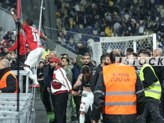 FBL-ISR Israeli Premier League Matchday 20 – Maccabi Tel Aviv (in yellow) vs. Hapoel Tel Aviv (in red and white), January 26, 2026, Bloomfield Stadium, Tel Aviv, Israel. After 12 years without a derby win, Hapoel Tel Aviv won 2-1, sparking celebrations in red.