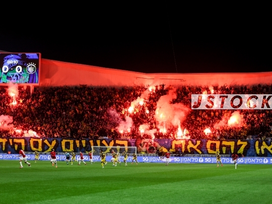 FBL-ISR Israeli Premier League Matchday 20 – Maccabi Tel Aviv (in yellow) vs. Hapoel Tel Aviv (in red and white), January 26, 2026, Bloomfield Stadium, Tel Aviv, Israel. After 12 years without a derby win, Hapoel Tel Aviv won 2-1, sparking celebrations in red.