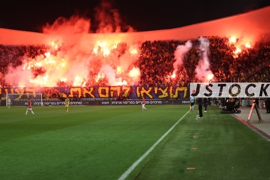 FBL-ISR Israeli Premier League Matchday 20 – Maccabi Tel Aviv (in yellow) vs. Hapoel Tel Aviv (in red and white), January 26, 2026, Bloomfield Stadium, Tel Aviv, Israel. After 12 years without a derby win, Hapoel Tel Aviv won 2-1, sparking celebrations in red.