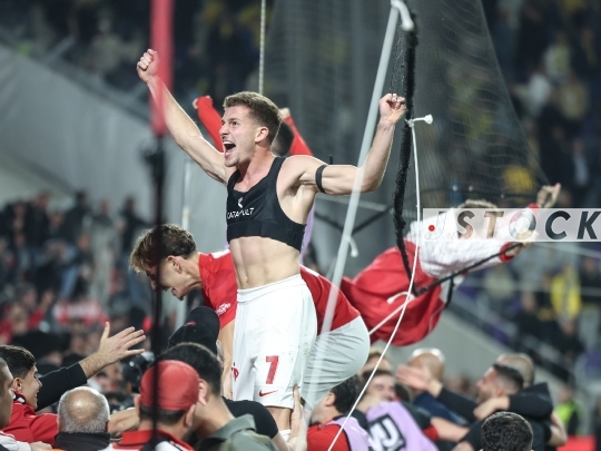 FBL-ISR Israeli Premier League Matchday 20 – Maccabi Tel Aviv (in yellow) vs. Hapoel Tel Aviv (in red and white), January 26, 2026, Bloomfield Stadium, Tel Aviv, Israel. After 12 years without a derby win, Hapoel Tel Aviv won 2-1, sparking celebrations in red.