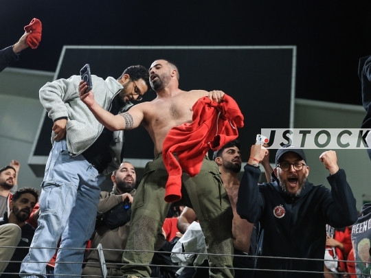 FBL-ISR Israeli Premier League Matchday 20 – Maccabi Tel Aviv (in yellow) vs. Hapoel Tel Aviv (in red and white), January 26, 2026, Bloomfield Stadium, Tel Aviv, Israel. After 12 years without a derby win, Hapoel Tel Aviv won 2-1, sparking celebrations in red.