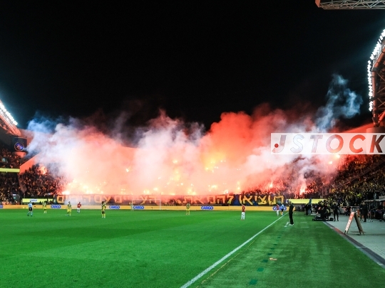 FBL-ISR Israeli Premier League Matchday 20 – Maccabi Tel Aviv (in yellow) vs. Hapoel Tel Aviv (in red and white), January 26, 2026, Bloomfield Stadium, Tel Aviv, Israel. After 12 years without a derby win, Hapoel Tel Aviv won 2-1, sparking celebrations in red.