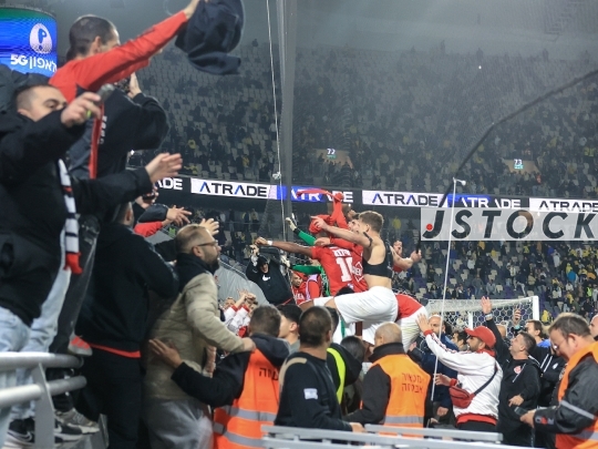 FBL-ISR Israeli Premier League Matchday 20 – Maccabi Tel Aviv (in yellow) vs. Hapoel Tel Aviv (in red and white), January 26, 2026, Bloomfield Stadium, Tel Aviv, Israel. After 12 years without a derby win, Hapoel Tel Aviv won 2-1, sparking celebrations in red.