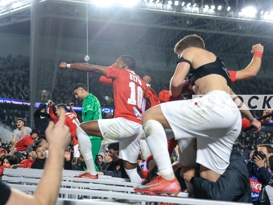FBL-ISR Israeli Premier League Matchday 20 – Maccabi Tel Aviv (in yellow) vs. Hapoel Tel Aviv (in red and white), January 26, 2026, Bloomfield Stadium, Tel Aviv, Israel. After 12 years without a derby win, Hapoel Tel Aviv won 2-1, sparking celebrations in red.
