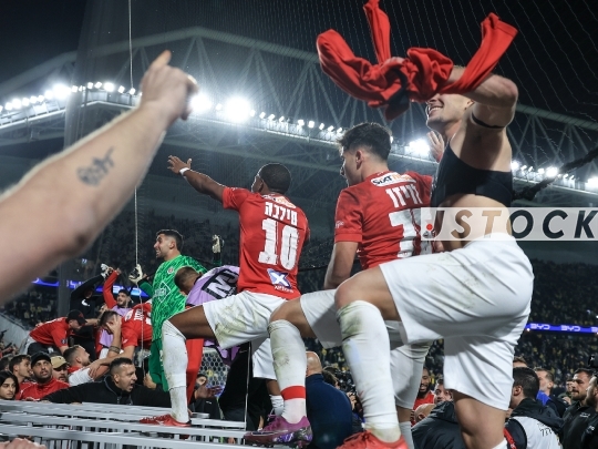 FBL-ISR Israeli Premier League Matchday 20 – Maccabi Tel Aviv (in yellow) vs. Hapoel Tel Aviv (in red and white), January 26, 2026, Bloomfield Stadium, Tel Aviv, Israel. After 12 years without a derby win, Hapoel Tel Aviv won 2-1, sparking celebrations in red.