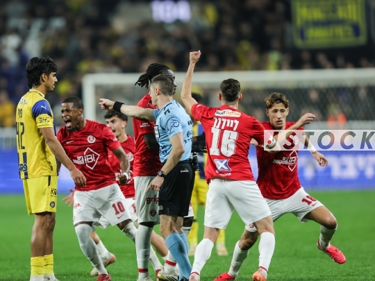 FBL-ISR Israeli Premier League Matchday 20 – Maccabi Tel Aviv (in yellow) vs. Hapoel Tel Aviv (in red and white), January 26, 2026, Bloomfield Stadium, Tel Aviv, Israel. After 12 years without a derby win, Hapoel Tel Aviv won 2-1, sparking celebrations in red.