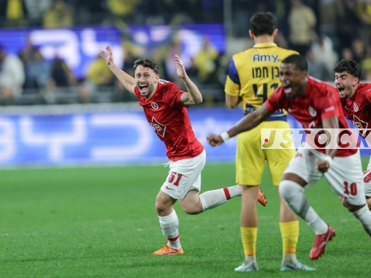 FBL-ISR Israeli Premier League Matchday 20 – Maccabi Tel Aviv (in yellow) vs. Hapoel Tel Aviv (in red and white), January 26, 2026, Bloomfield Stadium, Tel Aviv, Israel. After 12 years without a derby win, Hapoel Tel Aviv won 2-1, sparking celebrations in red.