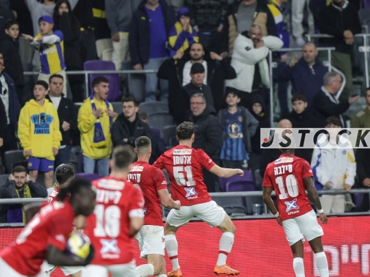 FBL-ISR Israeli Premier League Matchday 20 – Maccabi Tel Aviv (in yellow) vs. Hapoel Tel Aviv (in red and white), January 26, 2026, Bloomfield Stadium, Tel Aviv, Israel. After 12 years without a derby win, Hapoel Tel Aviv won 2-1, sparking celebrations in red.
