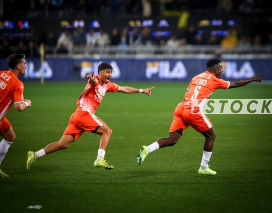 FBL-ISR Israeli Premier League Matchday 21 – Maccabi Tel Aviv (in yellow and white) vs. Beitar Jerusalem (in orange kits to identify with the Bibas family who were murdered in Hamas captivity), February 03, 2025, Bloomfield Stadium, Tel Aviv, Israel.