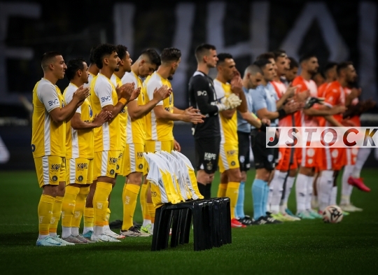 FBL-ISR Israeli Premier League Matchday 21 – Maccabi Tel Aviv (in yellow and white) vs. Beitar Jerusalem (in orange kits to identify with the Bibas family who were murdered in Hamas captivity), February 03, 2025, Bloomfield Stadium, Tel Aviv, Israel.