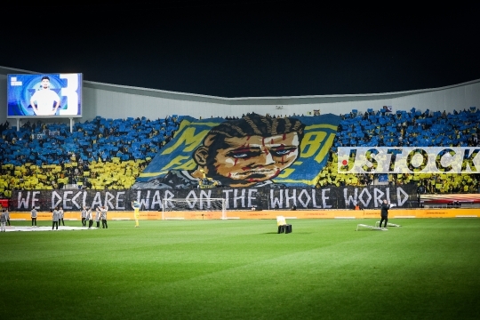 FBL-ISR Israeli Premier League Matchday 21 – Maccabi Tel Aviv (in yellow and white) vs. Beitar Jerusalem (in orange kits to identify with the Bibas family who were murdered in Hamas captivity), February 03, 2025, Bloomfield Stadium, Tel Aviv, Israel.