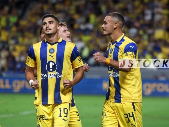 FBL-ISR Israeli Premier League Matchday 8 – Maccabi Tel Aviv (in yellow) vs. Hapoel Ironi Kiryat Shmona (in blue), October 27, 2025, Bloomfield Stadium, Tel Aviv, Israel.