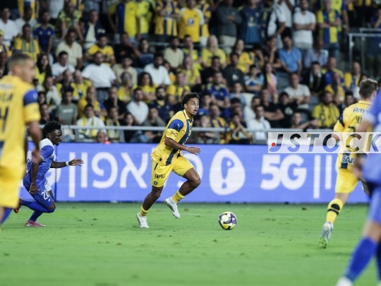 FBL-ISR Israeli Premier League Matchday 8 – Maccabi Tel Aviv (in yellow) vs. Hapoel Ironi Kiryat Shmona (in blue), October 27, 2025, Bloomfield Stadium, Tel Aviv, Israel.