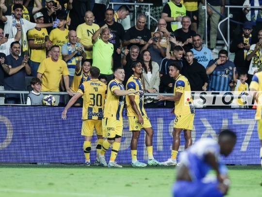 FBL-ISR Israeli Premier League Matchday 8 – Maccabi Tel Aviv (in yellow) vs. Hapoel Ironi Kiryat Shmona (in blue), October 27, 2025, Bloomfield Stadium, Tel Aviv, Israel.