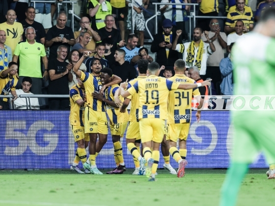 FBL-ISR Israeli Premier League Matchday 8 – Maccabi Tel Aviv (in yellow) vs. Hapoel Ironi Kiryat Shmona (in blue), October 27, 2025, Bloomfield Stadium, Tel Aviv, Israel.