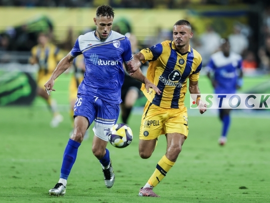 FBL-ISR Israeli Premier League Matchday 8 – Maccabi Tel Aviv (in yellow) vs. Hapoel Ironi Kiryat Shmona (in blue), October 27, 2025, Bloomfield Stadium, Tel Aviv, Israel.