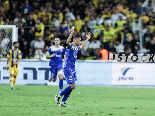 FBL-ISR Israeli Premier League Matchday 8 – Maccabi Tel Aviv (in yellow) vs. Hapoel Ironi Kiryat Shmona (in blue), October 27, 2025, Bloomfield Stadium, Tel Aviv, Israel.