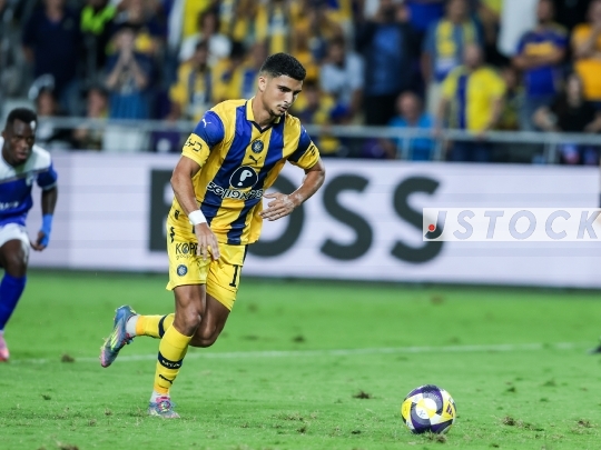 FBL-ISR Israeli Premier League Matchday 8 – Maccabi Tel Aviv (in yellow) vs. Hapoel Ironi Kiryat Shmona (in blue), October 27, 2025, Bloomfield Stadium, Tel Aviv, Israel.