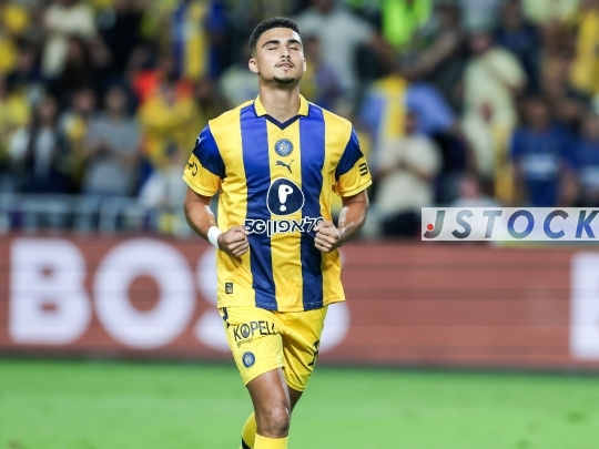 FBL-ISR Israeli Premier League Matchday 8 – Maccabi Tel Aviv (in yellow) vs. Hapoel Ironi Kiryat Shmona (in blue), October 27, 2025, Bloomfield Stadium, Tel Aviv, Israel.