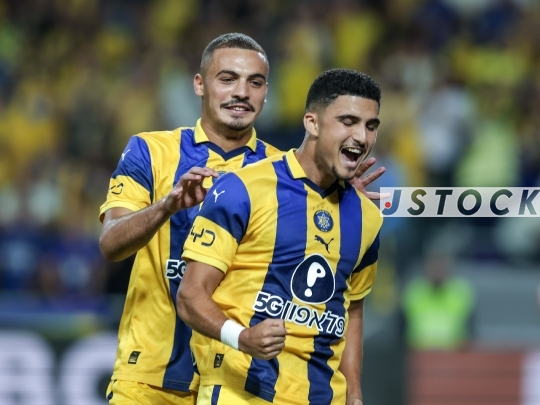 FBL-ISR Israeli Premier League Matchday 8 – Maccabi Tel Aviv (in yellow) vs. Hapoel Ironi Kiryat Shmona (in blue), October 27, 2025, Bloomfield Stadium, Tel Aviv, Israel.