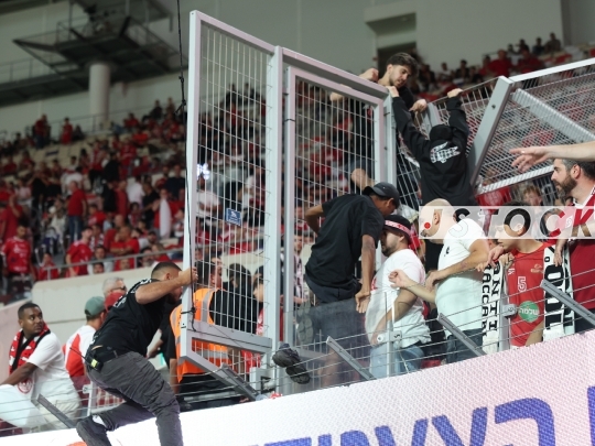 The Tel Aviv derby was abandoned after Hapoel Tel Aviv supporters threw flares onto the pitch, prompting police to halt the match due to safety concerns.