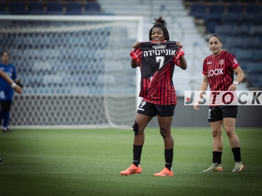FBL-ISR Women’s Premier League Matchday 26 – Hapoel Katamon Jerusalem (in red with black stripes) vs. MS Kiryat Gat (in white), May 15, 2025, Teddy Stadium, Jerusalem, Israel.