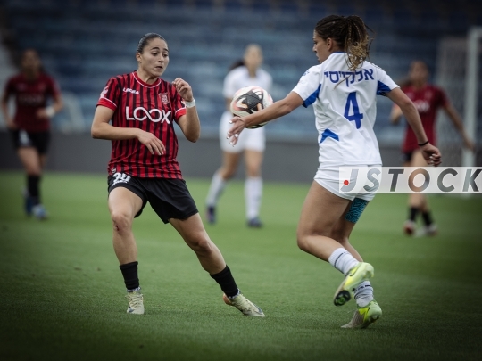 FBL-ISR Women’s Premier League Matchday 26 – Hapoel Katamon Jerusalem (in red with black stripes) vs. MS Kiryat Gat (in white), May 15, 2025, Teddy Stadium, Jerusalem, Israel.