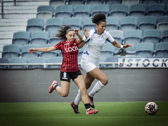 FBL-ISR Women’s Premier League Matchday 26 – Hapoel Katamon Jerusalem (in red with black stripes) vs. MS Kiryat Gat (in white), May 15, 2025, Teddy Stadium, Jerusalem, Israel.
