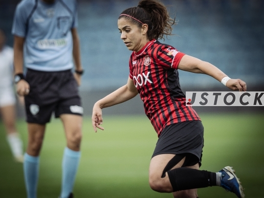 FBL-ISR Women’s Premier League Matchday 26 – Hapoel Katamon Jerusalem (in red with black stripes) vs. MS Kiryat Gat (in white), May 15, 2025, Teddy Stadium, Jerusalem, Israel.