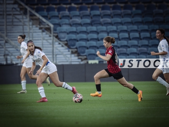 FBL-ISR Women’s Premier League Matchday 26 – Hapoel Katamon Jerusalem (in red with black stripes) vs. MS Kiryat Gat (in white), May 15, 2025, Teddy Stadium, Jerusalem, Israel.