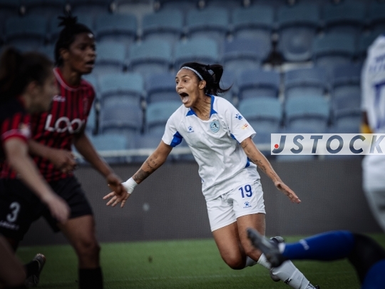 FBL-ISR Women’s Premier League Matchday 26 – Hapoel Katamon Jerusalem (in red with black stripes) vs. MS Kiryat Gat (in white), May 15, 2025, Teddy Stadium, Jerusalem, Israel.