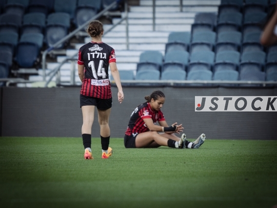 FBL-ISR Women’s Premier League Matchday 26 – Hapoel Katamon Jerusalem (in red with black stripes) vs. MS Kiryat Gat (in white), May 15, 2025, Teddy Stadium, Jerusalem, Israel.