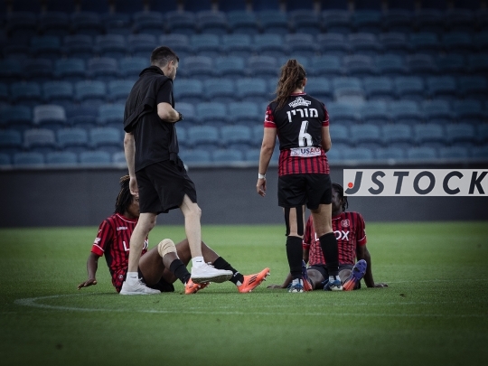 FBL-ISR Women’s Premier League Matchday 26 – Hapoel Katamon Jerusalem (in red with black stripes) vs. MS Kiryat Gat (in white), May 15, 2025, Teddy Stadium, Jerusalem, Israel.
