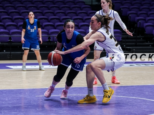 BSK-ISR Women's Basketball Premier League – Elitzur Holon (in white) vs. Maccabi Ironi Ramat Gan (in blue), March 30, 2026, Toto Hall, Holon, Israel. The league returns to play following a hiatus caused by the ongoing war between Israel, the USA, and Iran.