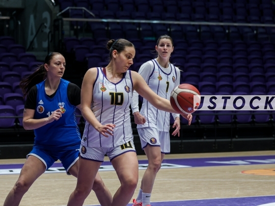 BSK-ISR Women's Basketball Premier League – Elitzur Holon (in white) vs. Maccabi Ironi Ramat Gan (in blue), March 30, 2026, Toto Hall, Holon, Israel. The league returns to play following a hiatus caused by the ongoing war between Israel, the USA, and Iran.