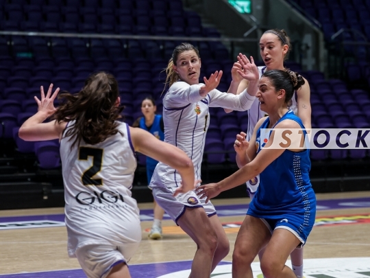 BSK-ISR Women's Basketball Premier League – Elitzur Holon (in white) vs. Maccabi Ironi Ramat Gan (in blue), March 30, 2026, Toto Hall, Holon, Israel. The league returns to play following a hiatus caused by the ongoing war between Israel, the USA, and Iran.
