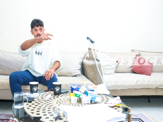 JERUSALEM, ISRAEL - DECEMBER 16, 2025: Qais Haddad, a 21-year-old security team leader from Beit Hanina, at Teddy Stadium. Haddad claims he was brutally attacked and subjected to racial slurs by three plainclothes police officers at the stadium entrance during the match between Beitar Jerusalem and Hapoel Jerusalem. According to Haddad, the assault occurred after he requested the officers to undergo a standard ticket inspection.