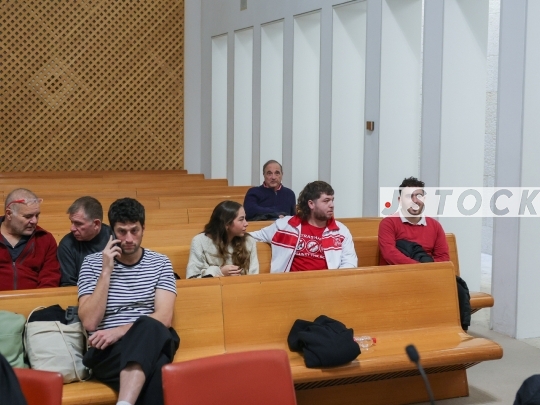 JERUSALEM, ISRAEL - DECEMBER 18, 2025: Hapoel Tel Aviv fans at the Supreme Court during a petition against the Israel Police. The legal action was taken after police officers prevented supporters from entering stadiums while wearing shirts featuring slogans against the police, Maccabi Tel Aviv, and the Kahane Chai movement.