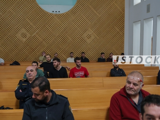 JERUSALEM, ISRAEL - DECEMBER 18, 2025: Hapoel Tel Aviv fans at the Supreme Court during a petition against the Israel Police. The legal action was taken after police officers prevented supporters from entering stadiums while wearing shirts featuring slogans against the police, Maccabi Tel Aviv, and the Kahane Chai movement.