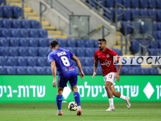FBL-ISR Israeli Premier League Matchday 26—Hapoel Petah Tikva (in blue) vs. Hapoel Tel Aviv (in red shirts and white shorts), April 11, 2026, at HaMoshava Stadium, Petah Tikva, Israel. This is the final round of the regular season before the playoffs.Photo by Shaul Greenfeld / JStock