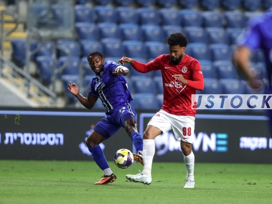 FBL-ISR Israeli Premier League Matchday 26—Hapoel Petah Tikva (in blue) vs. Hapoel Tel Aviv (in red shirts and white shorts), April 11, 2026, at HaMoshava Stadium, Petah Tikva, Israel. This is the final round of the regular season before the playoffs.Photo by Shaul Greenfeld / JStock