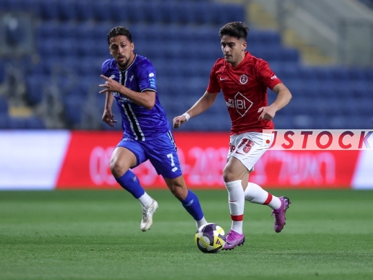 FBL-ISR Israeli Premier League Matchday 26—Hapoel Petah Tikva (in blue) vs. Hapoel Tel Aviv (in red shirts and white shorts), April 11, 2026, at HaMoshava Stadium, Petah Tikva, Israel. This is the final round of the regular season before the playoffs.Photo by Shaul Greenfeld / JStock
