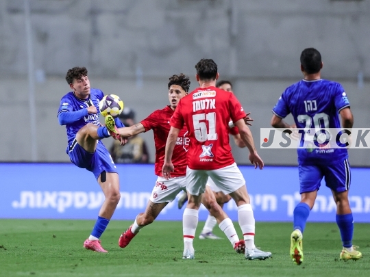FBL-ISR Israeli Premier League Matchday 26—Hapoel Petah Tikva (in blue) vs. Hapoel Tel Aviv (in red shirts and white shorts), April 11, 2026, at HaMoshava Stadium, Petah Tikva, Israel. This is the final round of the regular season before the playoffs.Photo by Shaul Greenfeld / JStock